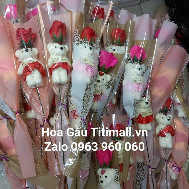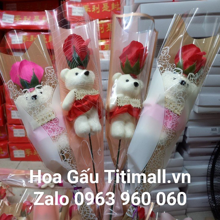 Bó 1 Gấu & 1 Bông Hồng Sáp Giấy Kiếng