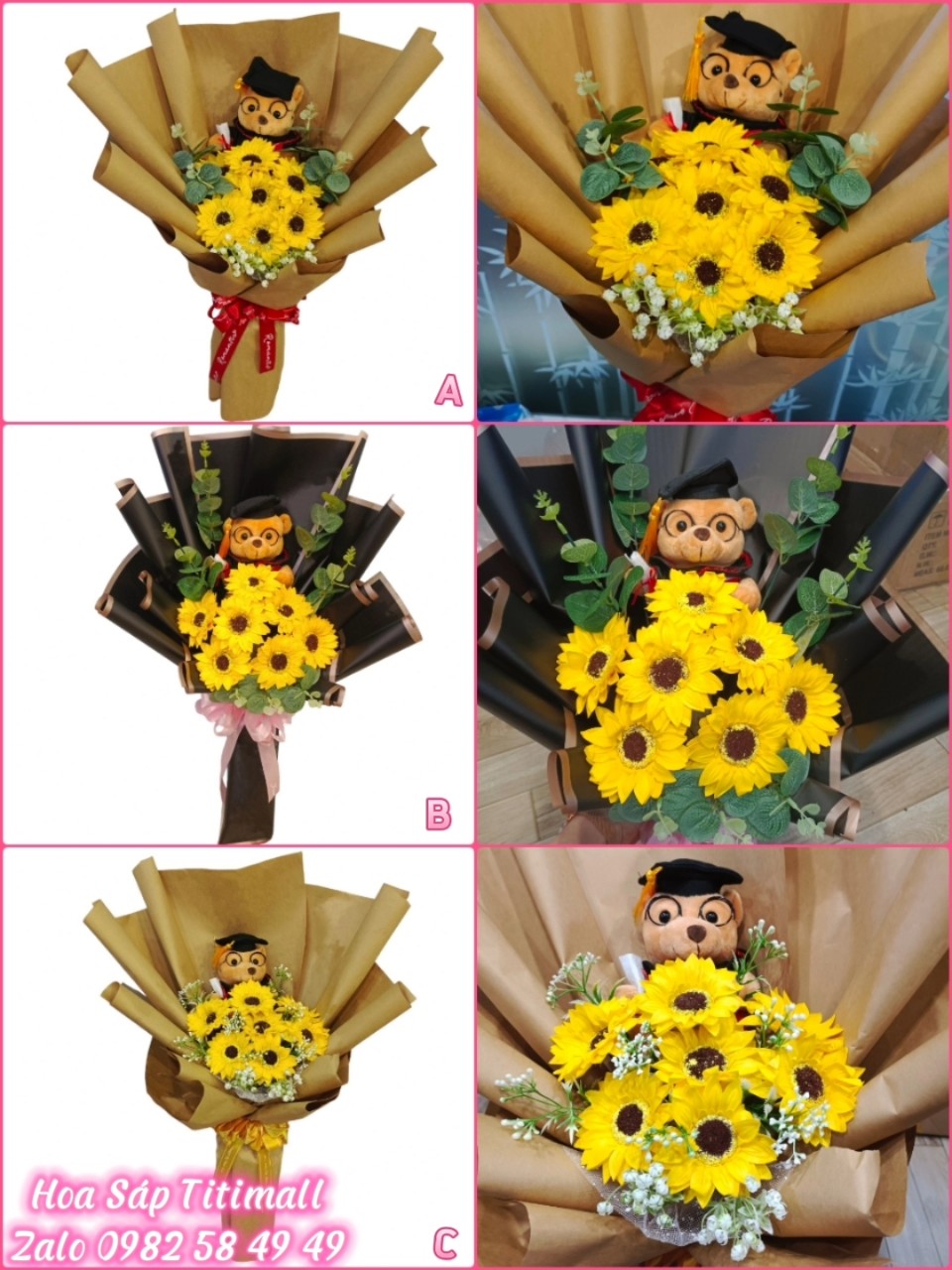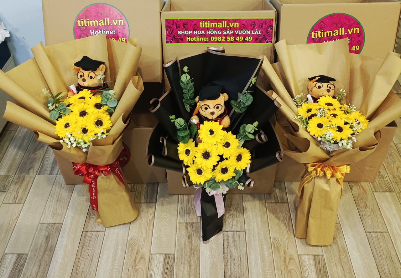 Đặc biệt còn có phụ kiện các loại như đầu hoa, giấy gói, nơ, ruy băng,… để bạn có thể tự sáng tạo những bó hoa sáp hướng dương không đụng hàng.